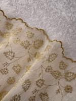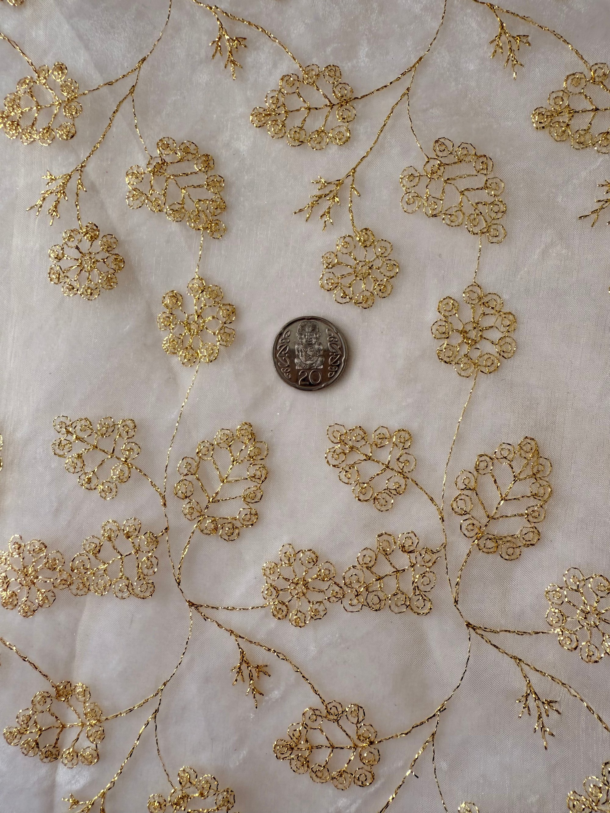 THIS FABRIC: Semi stiff Honey coloured organza with the sweetest gold lurex embroidered leaves. Scalloped embroidered edge on both selvages