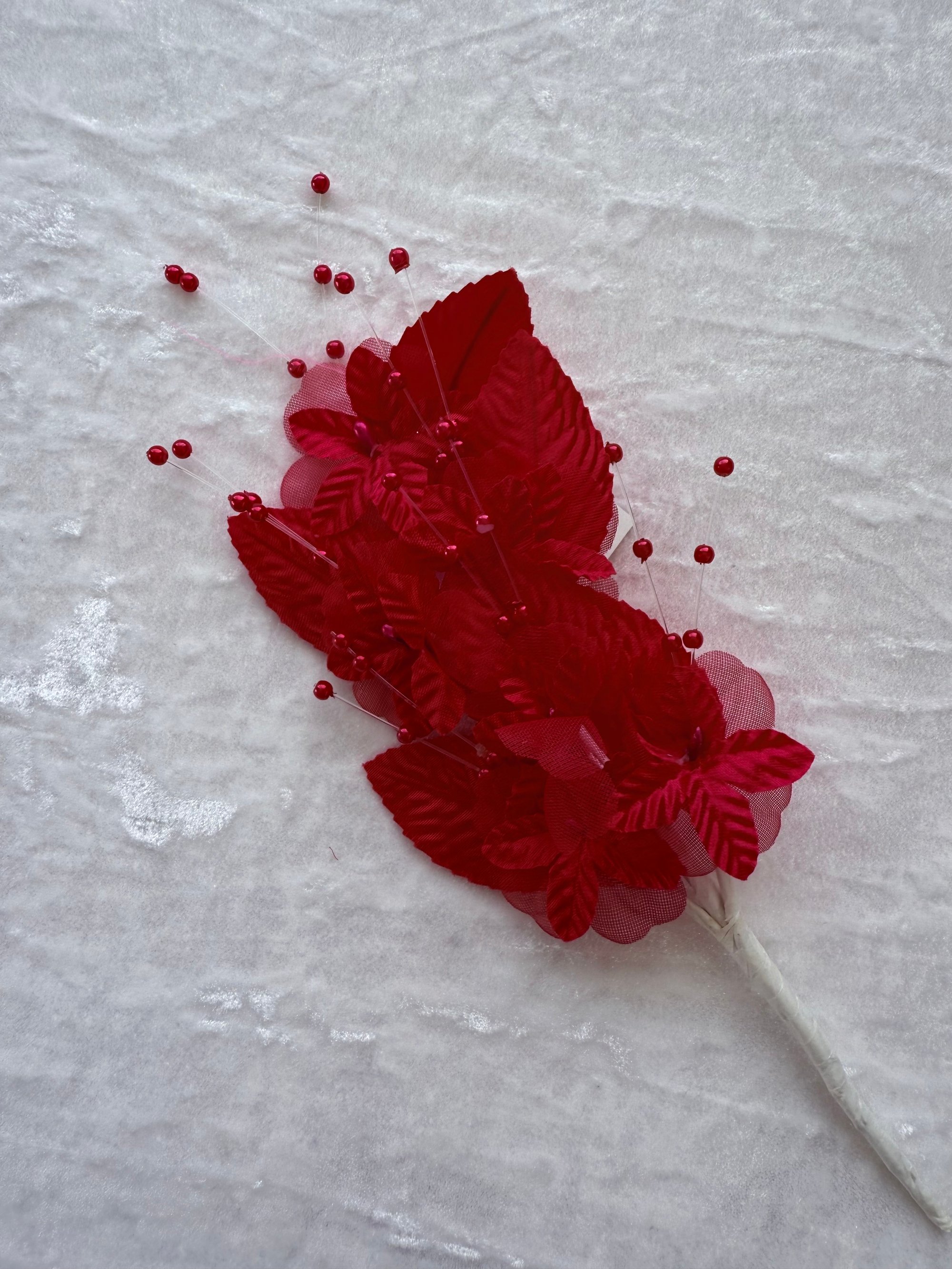 Flat spray of mixed Red flowers and leaves with pearls Approx size (without pearls) 110 x 80mm