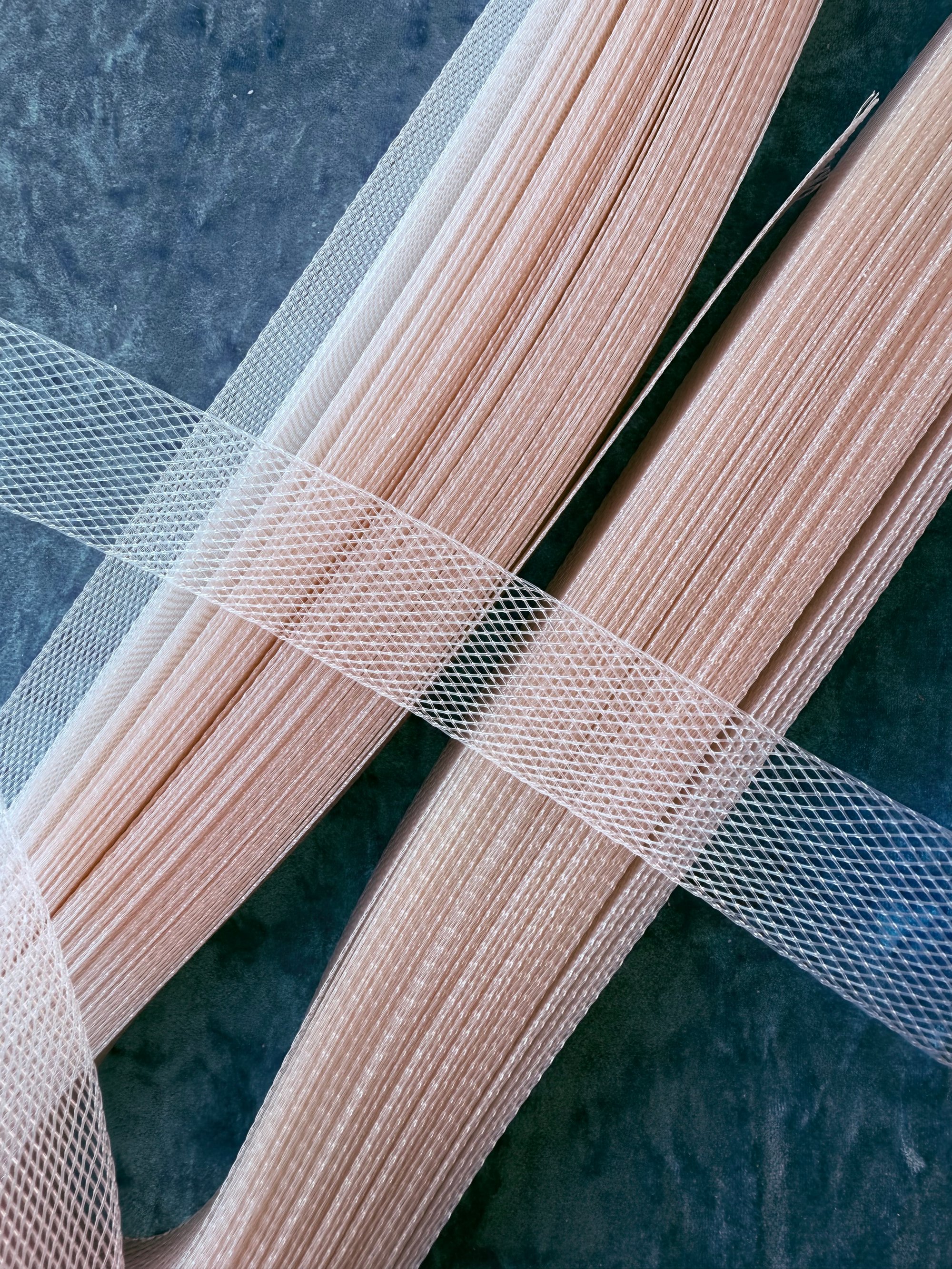 This one in a light beige has a firm finish so ideal for headpiece and tiara attachments, also perfect for straight edge hems where a fluted finish is desired