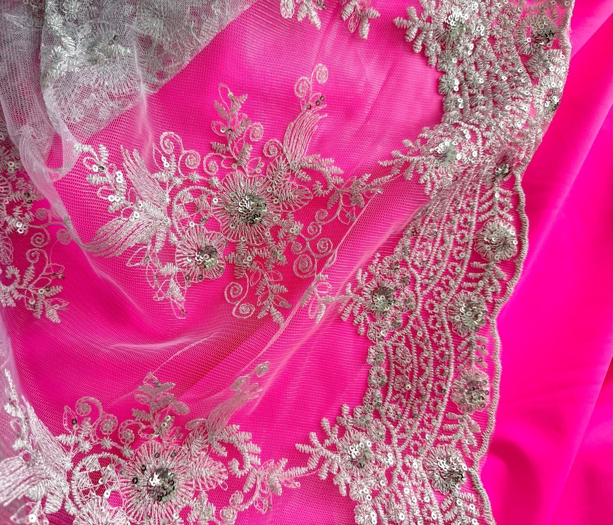 Shown here over Neon Pink, beautiful floral embroidered motifs and a lovely scalloped edge on both selvedges.