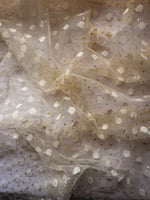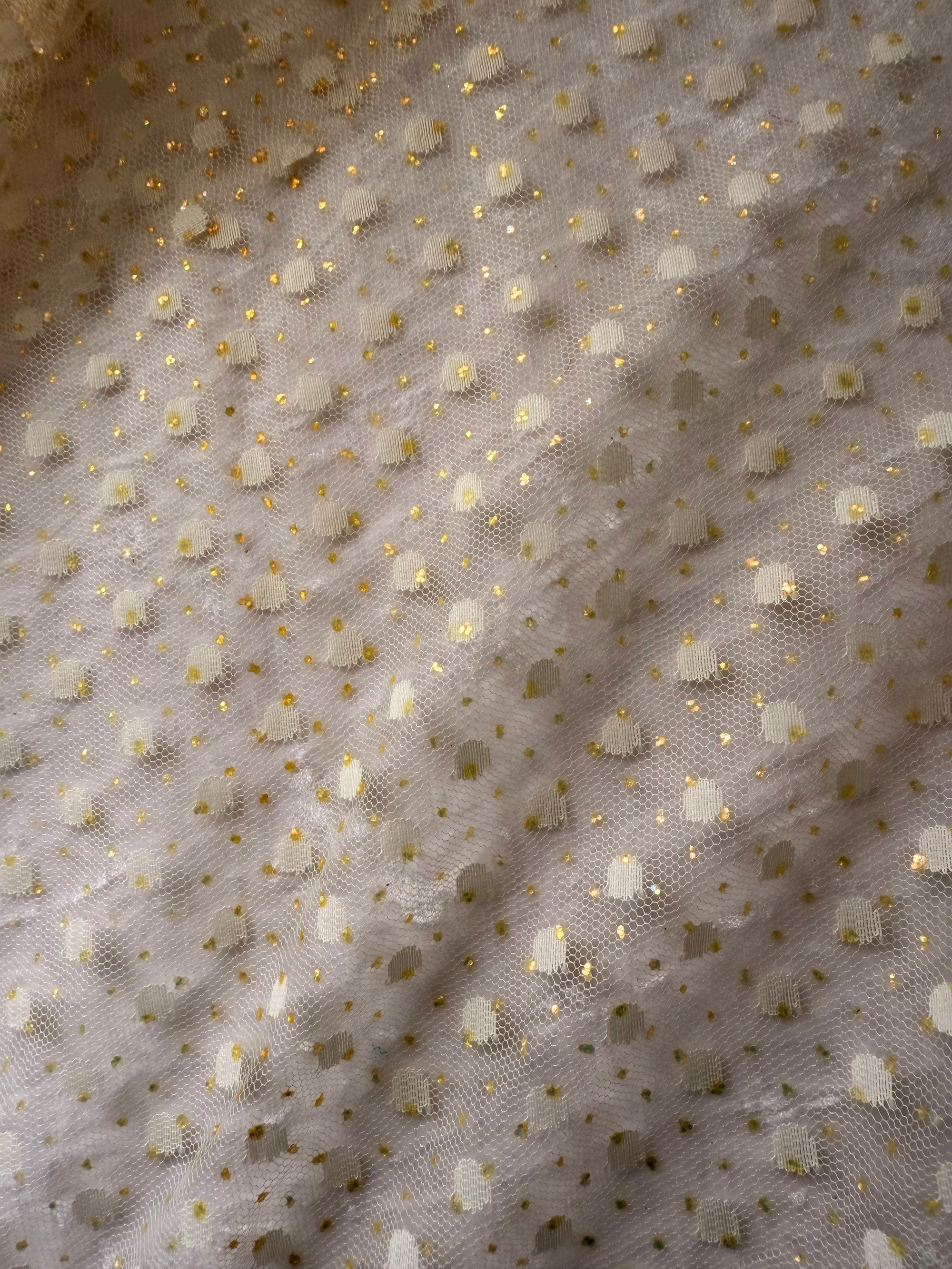 THIS FABRIC: Overall soft cream tulle with cream spots and deep gold lurex dots